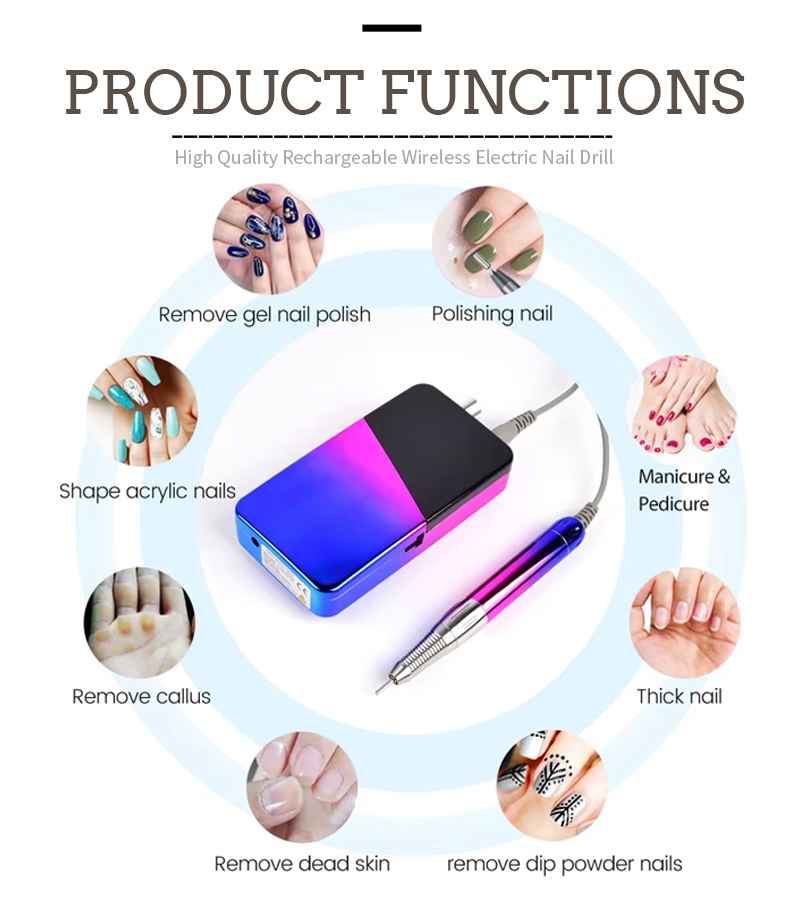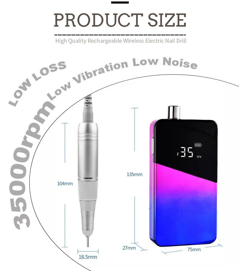 Thiết kế màn hình của máy khoan móng tay điện 30.000 vòng / phút này có công tắc bật/tắt và xoay tiến/lùi để kích hoạt tổng cộng bằng một nút bấm, ổ cắm sạc nhanh ở phía dưới, ổ cắm máy khoan có thể thay thế ở phía trên và tốc độ điều chỉnh ba vị trí để đáp ứng nhiều nhu cầu khác nhau.