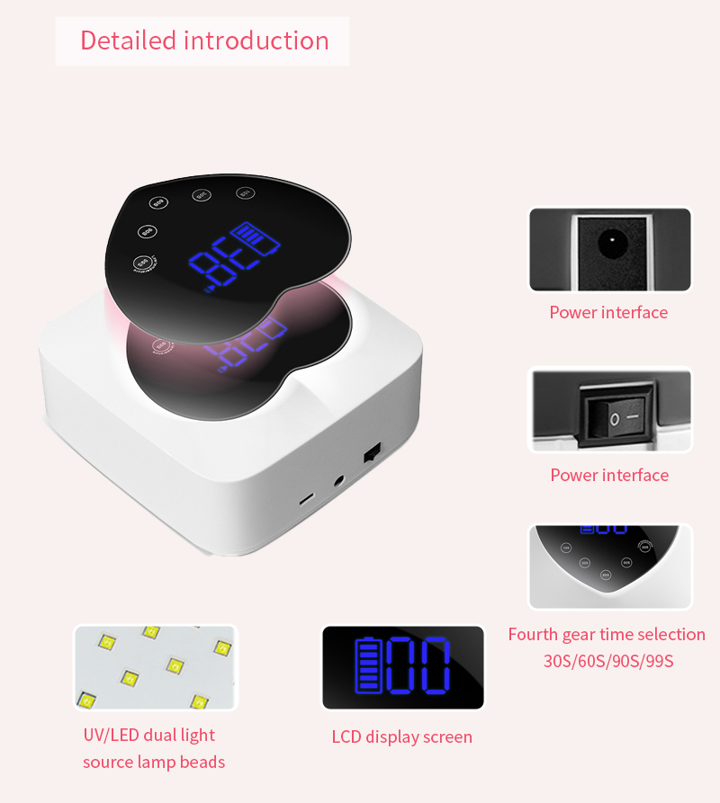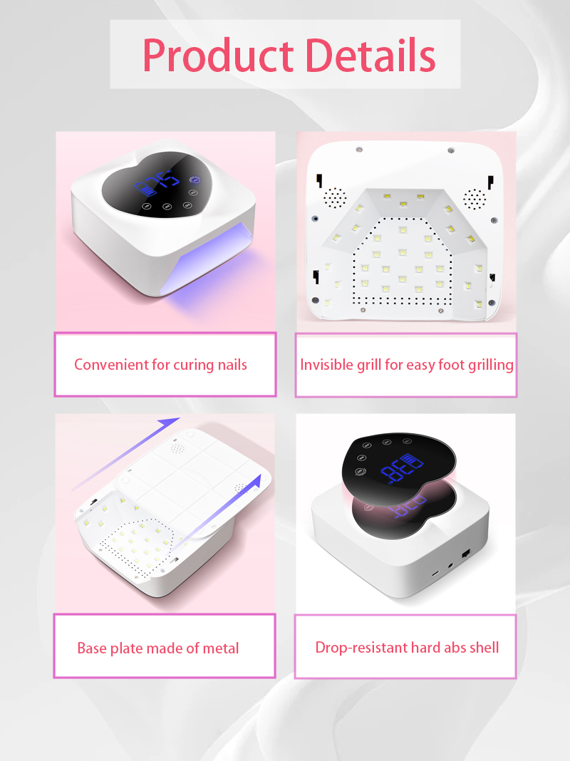 Sản phẩm đảm bảo keo khô đều mà không bị co ngót. Nguồn ánh sáng kép của nó cung cấp khả năng sưởi ấm nhẹ nhàng để tránh đổi màu tay và mỏi mắt, phù hợp cho cả tay và chân, mang lại kết quả làm khô nhanh đáng kể.