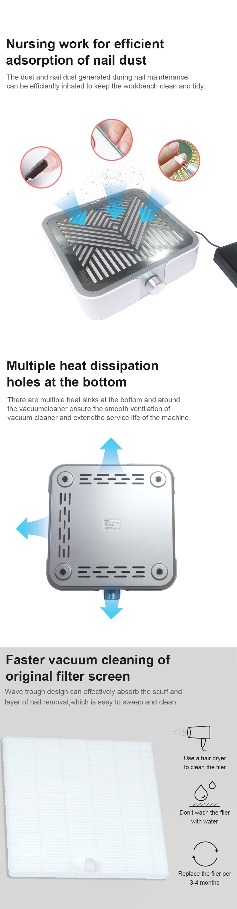 Sản phẩm có khả năng hấp phụ mạnh các mảnh vụn móng tay, không rò rỉ bụi, giữ cho mặt bàn sạch sẽ và gọn gàng, hút bụi nhanh không rò rỉ bụi, công suất cao hiệu quả hơn.