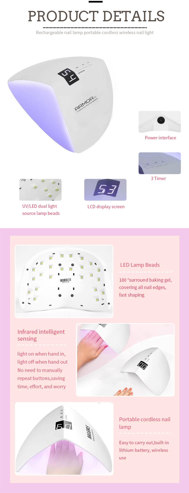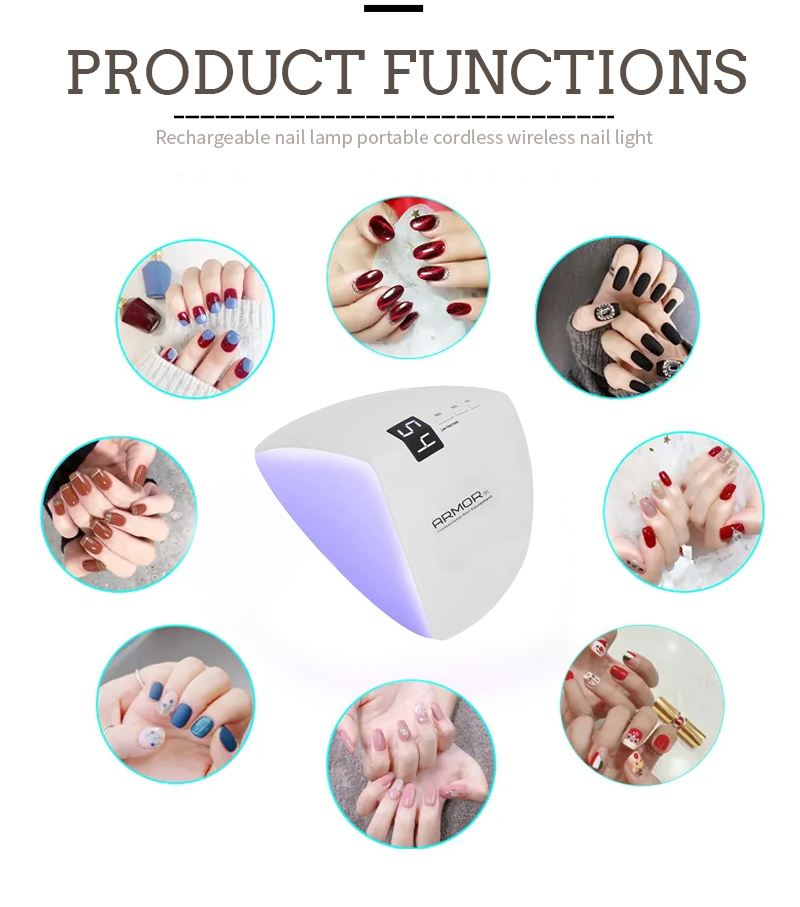 Sản phẩm đảm bảo keo khô đều mà không bị co ngót. Nguồn ánh sáng kép của nó cung cấp khả năng sưởi ấm nhẹ nhàng để tránh đổi màu tay và mỏi mắt, phù hợp cho cả tay và chân, mang lại kết quả làm khô nhanh đáng kể.