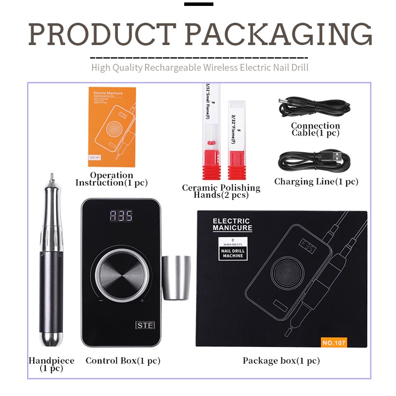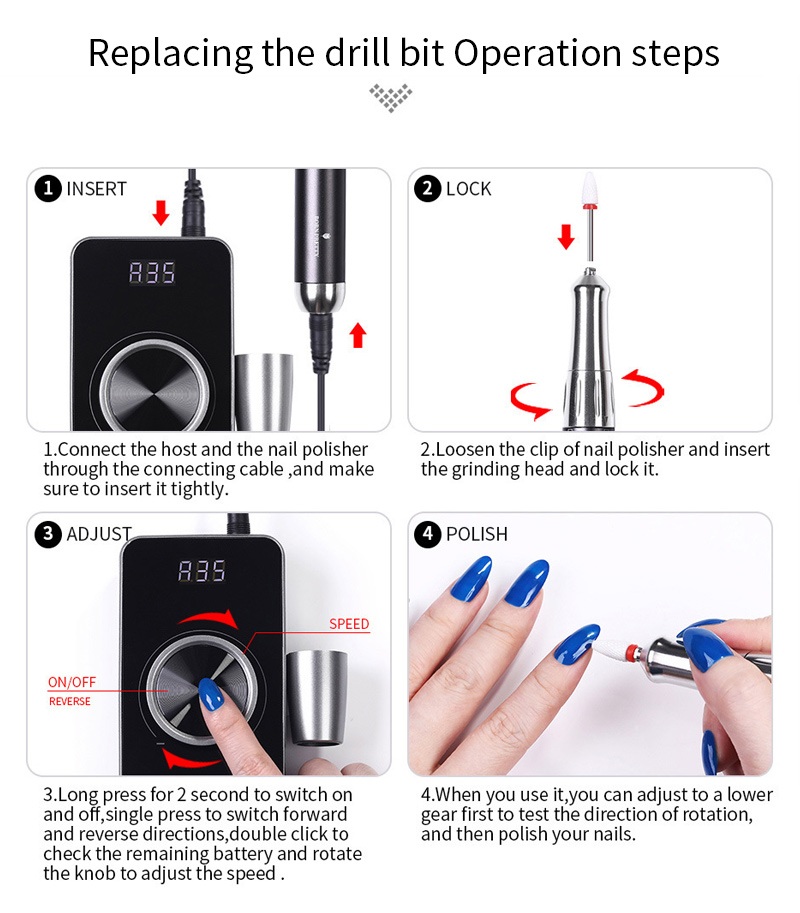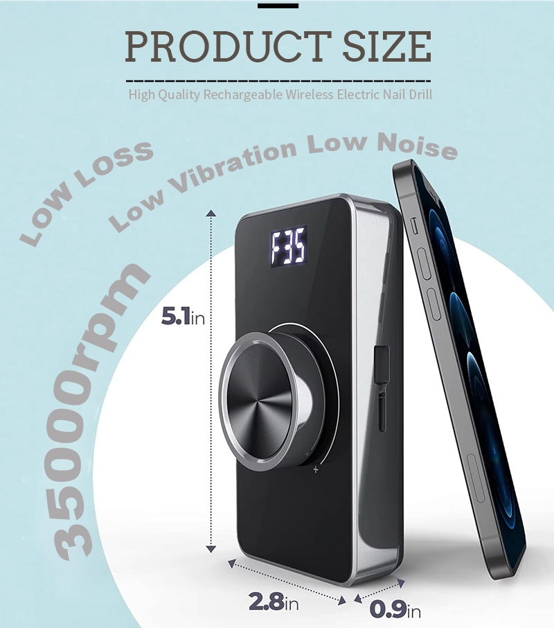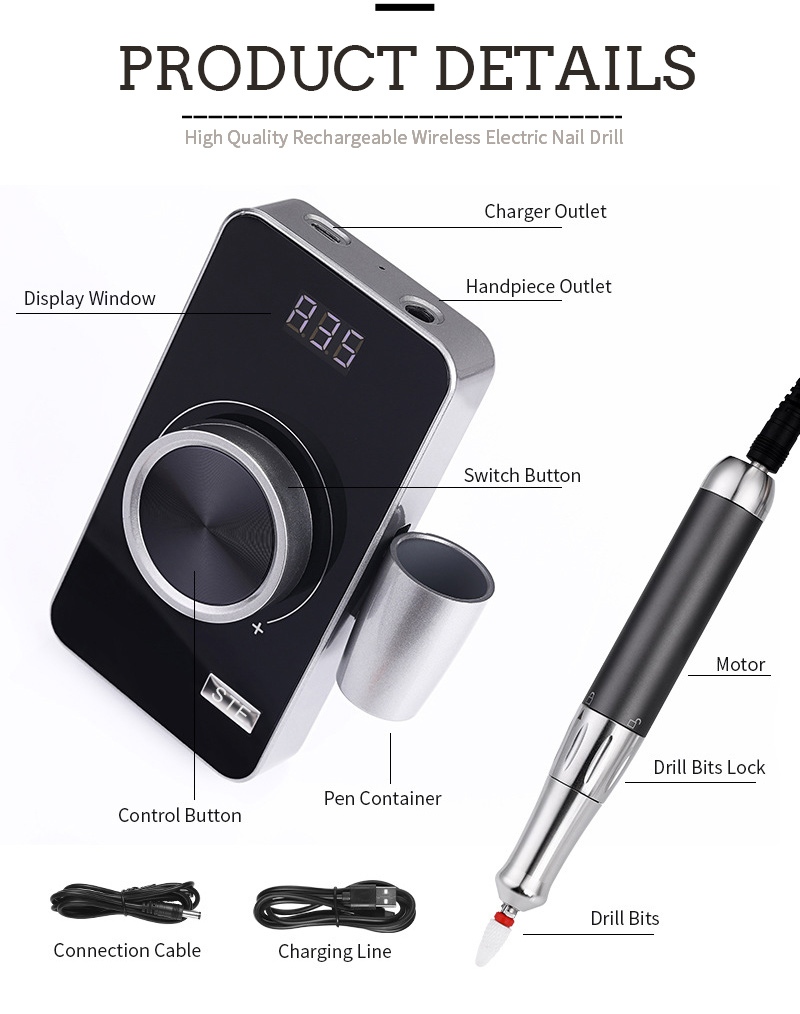 Thiết kế màn hình của máy khoan móng tay điện tẩy tế bào chết 35.000 vòng / phút này có công tắc bật/tắt và xoay tiến/lùi để kích hoạt tổng cộng bằng một nút bấm, ổ cắm sạc nhanh ở phía dưới, ổ cắm máy khoan có thể thay thế ở phía trên và tốc độ điều chỉnh ba vị trí để đáp ứng nhiều nhu cầu khác nhau.