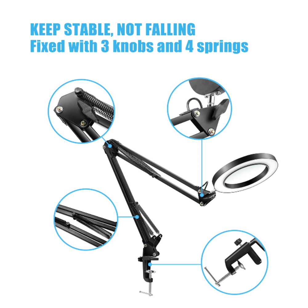 Đèn bàn phóng đại xoay 360 độ có thể gập lại này có thiết kế trang nhã và tinh tế. Ánh sáng nhẹ nhàng dễ chịu cho mắt, mô phỏng ánh sáng dịu nhẹ, tự nhiên của bình minh để chiếu sáng thoải mái, không chói. Thích hợp cho nhiều ứng dụng bao gồm xăm mình, thêu và nghệ thuật làm móng.