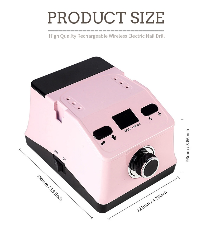 Thiết kế màn hình của máy khoan và đánh bóng móng tay cầm tay này có công tắc bật/tắt và xoay tiến/lùi để kích hoạt tổng cộng bằng một nút bấm, ổ cắm sạc nhanh ở phía dưới, ổ cắm máy khoan có thể thay thế ở phía trên và tốc độ điều chỉnh ba vị trí để đáp ứng nhiều nhu cầu khác nhau.