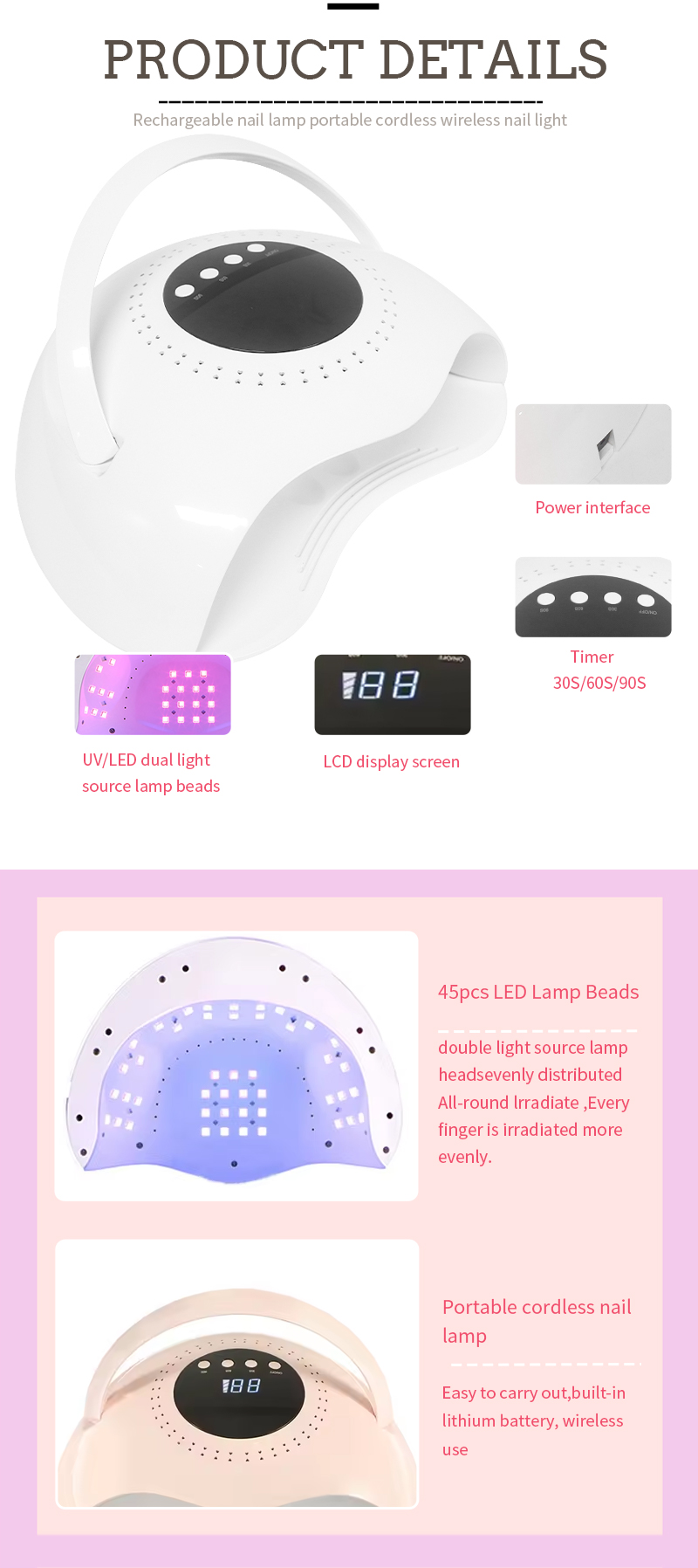 Sản phẩm đảm bảo keo khô đều mà không bị co ngót. Nguồn ánh sáng kép của nó cung cấp khả năng sưởi ấm nhẹ nhàng để tránh đổi màu tay và mỏi mắt, phù hợp cho cả tay và chân, mang lại kết quả làm khô nhanh đáng kể.