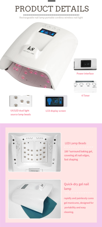 Đèn sấy móng tay công suất lớn có tay cầm đảm bảo keo khô đều mà không bị co rút. Nguồn ánh sáng kép của nó cung cấp khả năng sưởi ấm nhẹ nhàng để tránh đổi màu tay và mỏi mắt, phù hợp cho cả tay và chân, mang lại kết quả làm khô nhanh đáng kể.