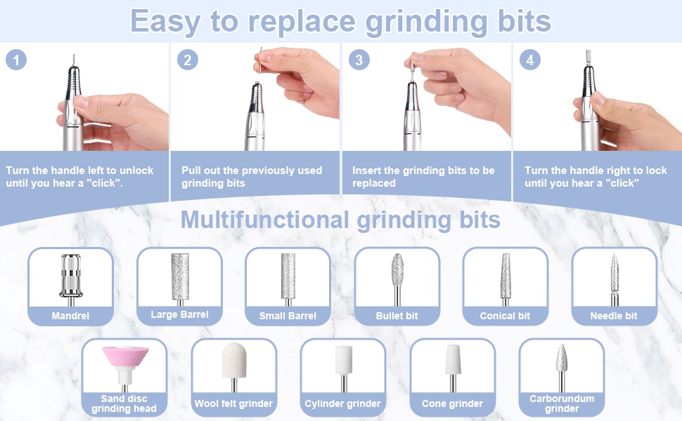 Phương pháp vận hành máy khoan thay thế bộ dụng cụ khoan móng tay cầm tay ít tiếng ồn này, nghĩa là cắm và rút ra, dễ dàng và thuận tiện, có thể sử dụng thay thế sau khi hoàn thành.