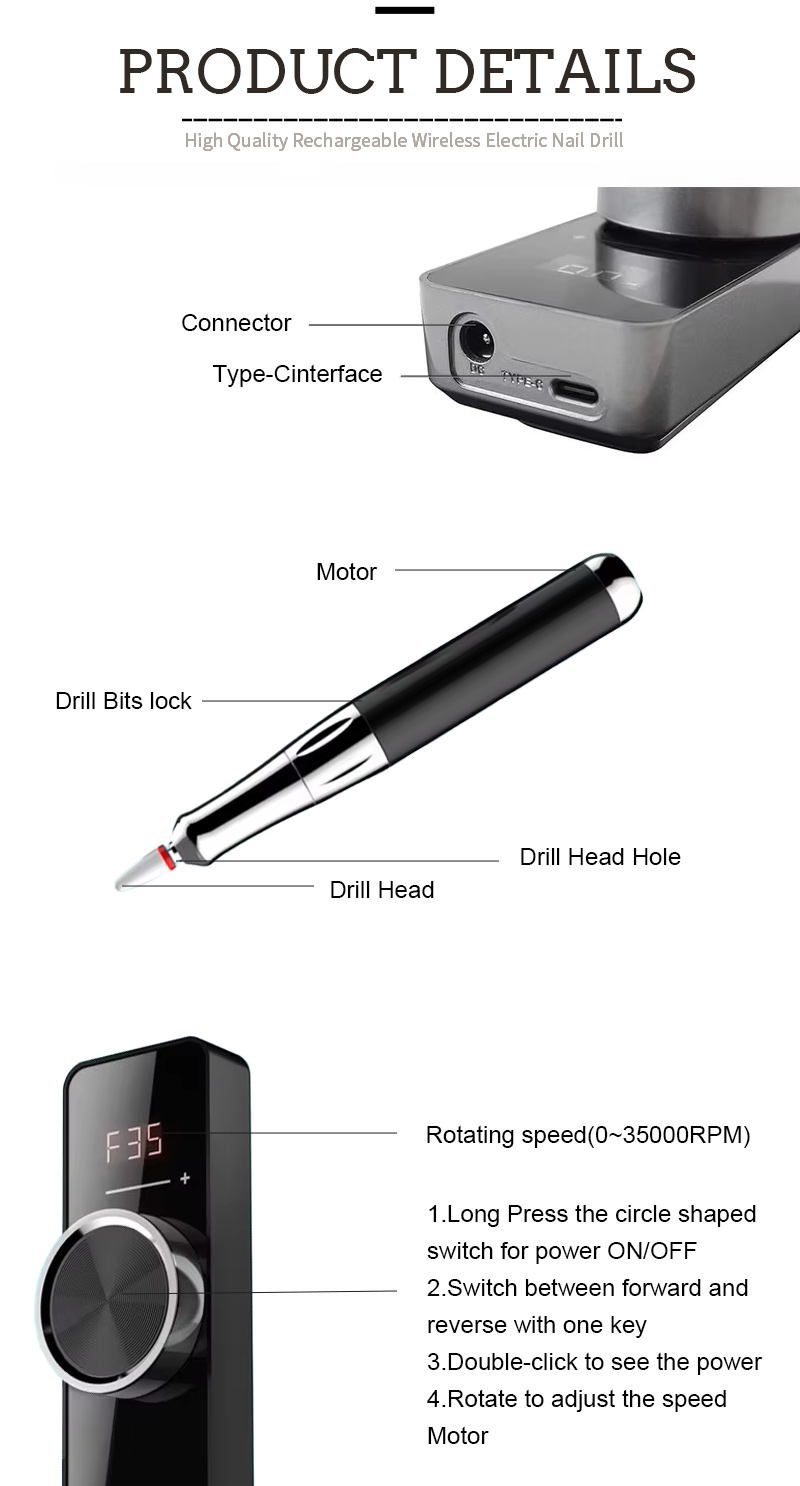 Bộ máy khoan móng tay cầm tay chạy điện với động cơ mạnh mẽ 65w 35000rpm