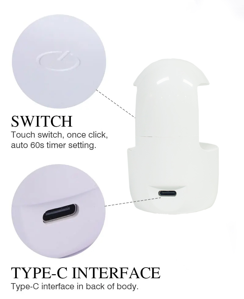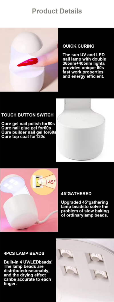 Đèn làm móng tay mini một ngón đảm bảo keo khô đều mà không bị co rút. Nguồn ánh sáng kép của nó cung cấp khả năng sưởi ấm nhẹ nhàng để tránh đổi màu tay và mỏi mắt, phù hợp cho cả tay và chân, mang lại kết quả làm khô nhanh đáng kể.
