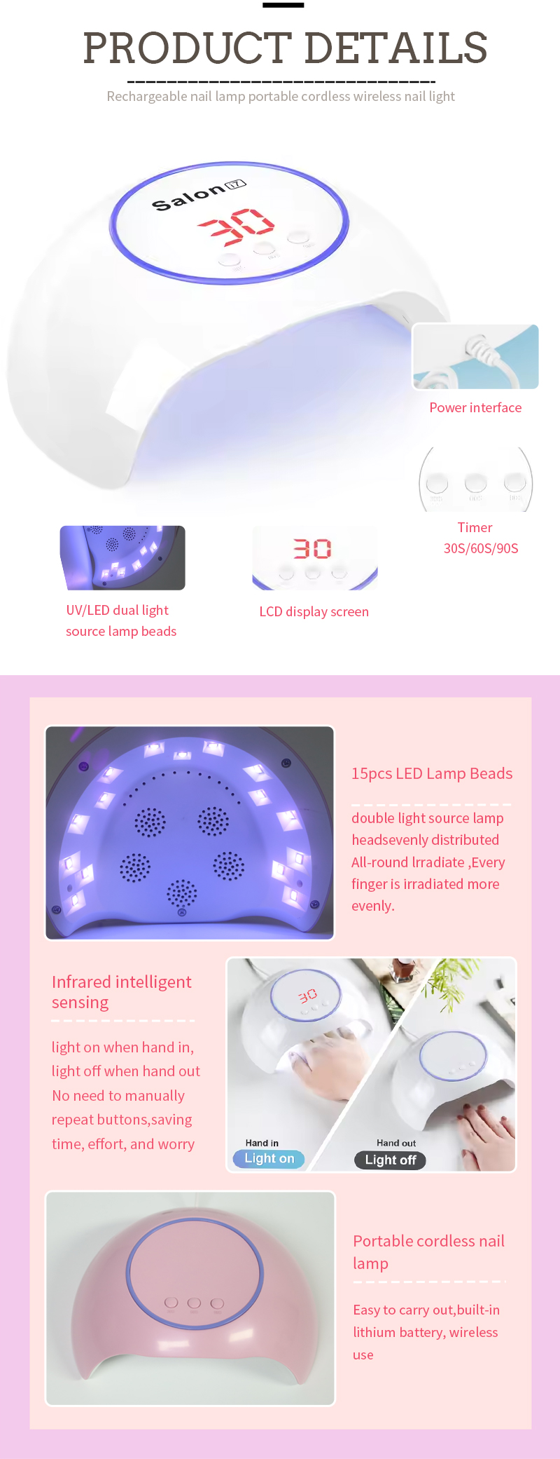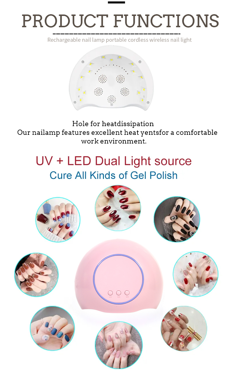 Sản phẩm đảm bảo keo khô đều mà không bị co ngót. Nguồn ánh sáng kép của nó cung cấp khả năng sưởi ấm nhẹ nhàng để tránh đổi màu tay và mỏi mắt, phù hợp cho cả tay và chân, mang lại kết quả làm khô nhanh đáng kể.