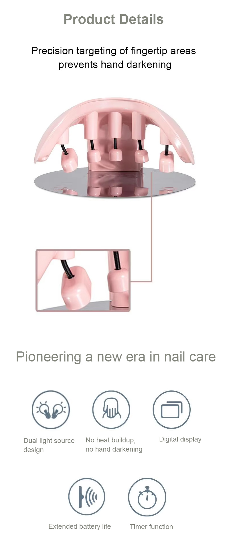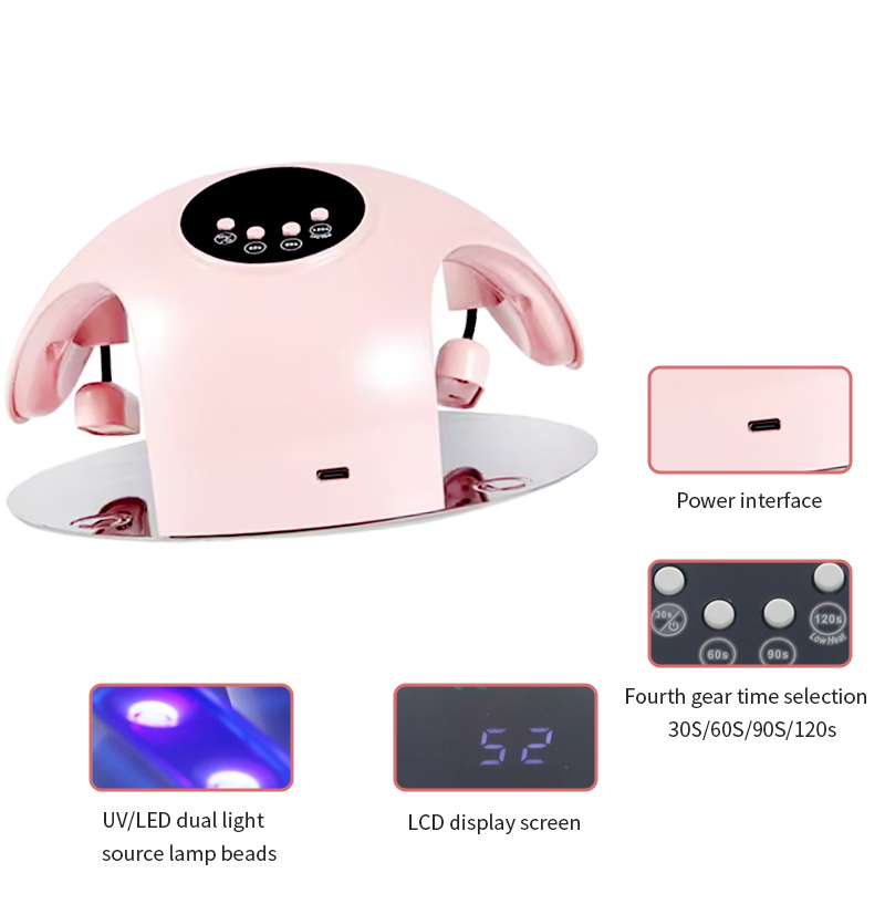 Sản phẩm đảm bảo keo khô đều mà không bị co ngót. Nguồn ánh sáng kép của nó cung cấp khả năng sưởi ấm nhẹ nhàng để tránh đổi màu tay và mỏi mắt, phù hợp cho cả tay và chân, mang lại kết quả làm khô nhanh đáng kể.