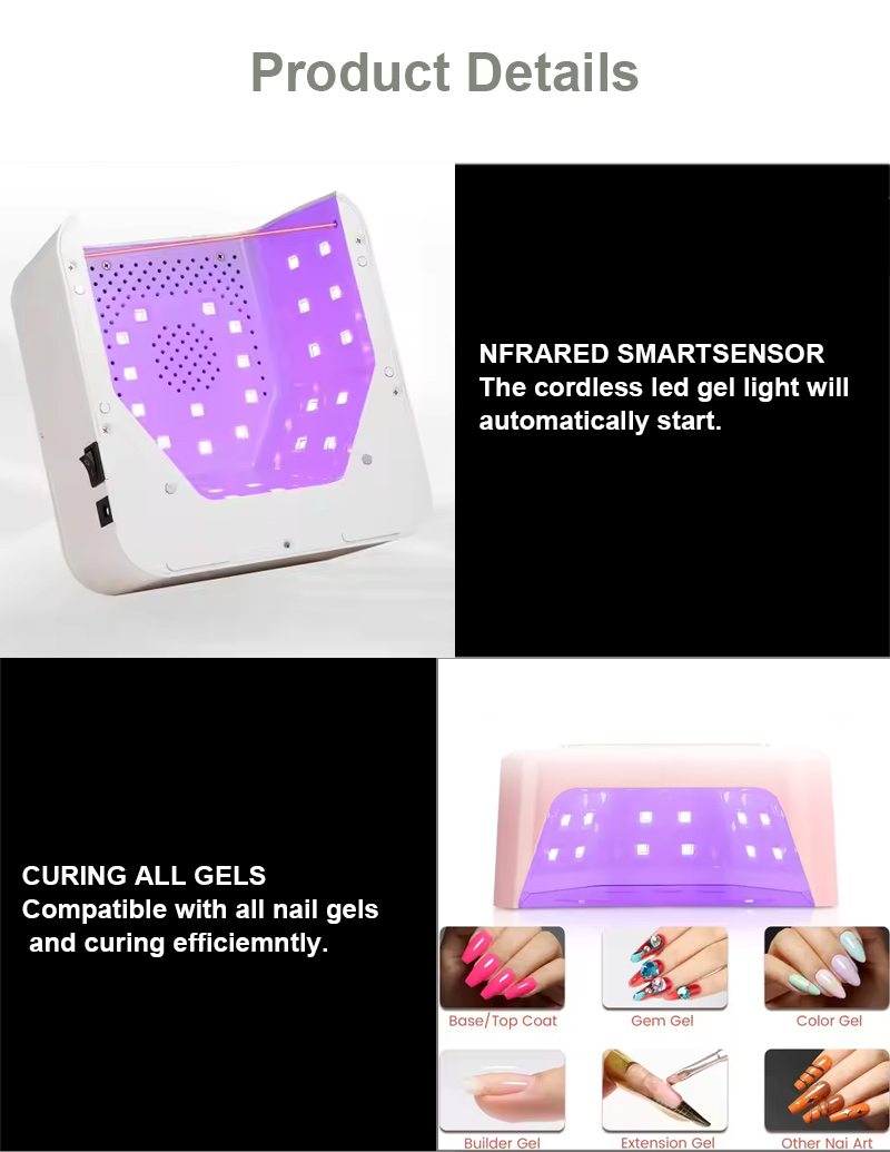 Các sản phẩm chính của chúng tôi bao gồm đèn LED dán móng tay: 186W/168W/86W/84W/80W/75W/72W/65W/60W/54W/50W/48W/36W/24W/16W/12W/6W/3W, v.v. Các mẫu không dây có thể sạc lại: 156W/120W/96W/90W/86W/84W/80W/72W/66W/64W/60W/54W/48W v.v. Máy khoan móng nghệ thuật: 80W/65W/60W/45W/35W/25W/15W, v.v. Model sạc không dây: 45W, 35W, 30W, 25W, 20W, 15W, v.v. 25000RPM/30000RPM/35000RPM/40000RPM/45000RPM/Không chổi than/Không chổi than tốc độ cực cao. Máy hút bụi đầy đủ. 80W/68W/60W/48W/45W/40W/36W/30W/25W/20W/15W/6W, v.v., Các mẫu sạc không dây: 80W, 60W, 40W, 30W.
