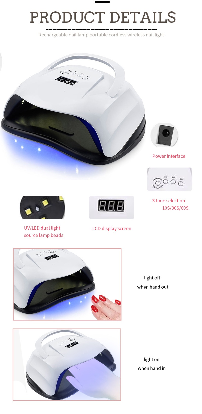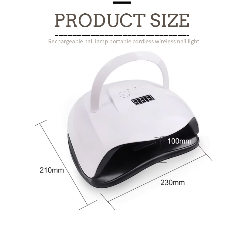 Đèn sấy móng tay di động có công nghệ cảm biến thông minh hồng ngoại tự động chiếu sáng khi tay đến gần và tắt khi tay di chuyển ra xa—loại bỏ rắc rối khi phải nhấn nút nhiều lần và tiết kiệm thời gian và công sức. Keo nướng công suất cao không cần phải chờ đợi lâu, tiết kiệm cả thời gian và công sức.
