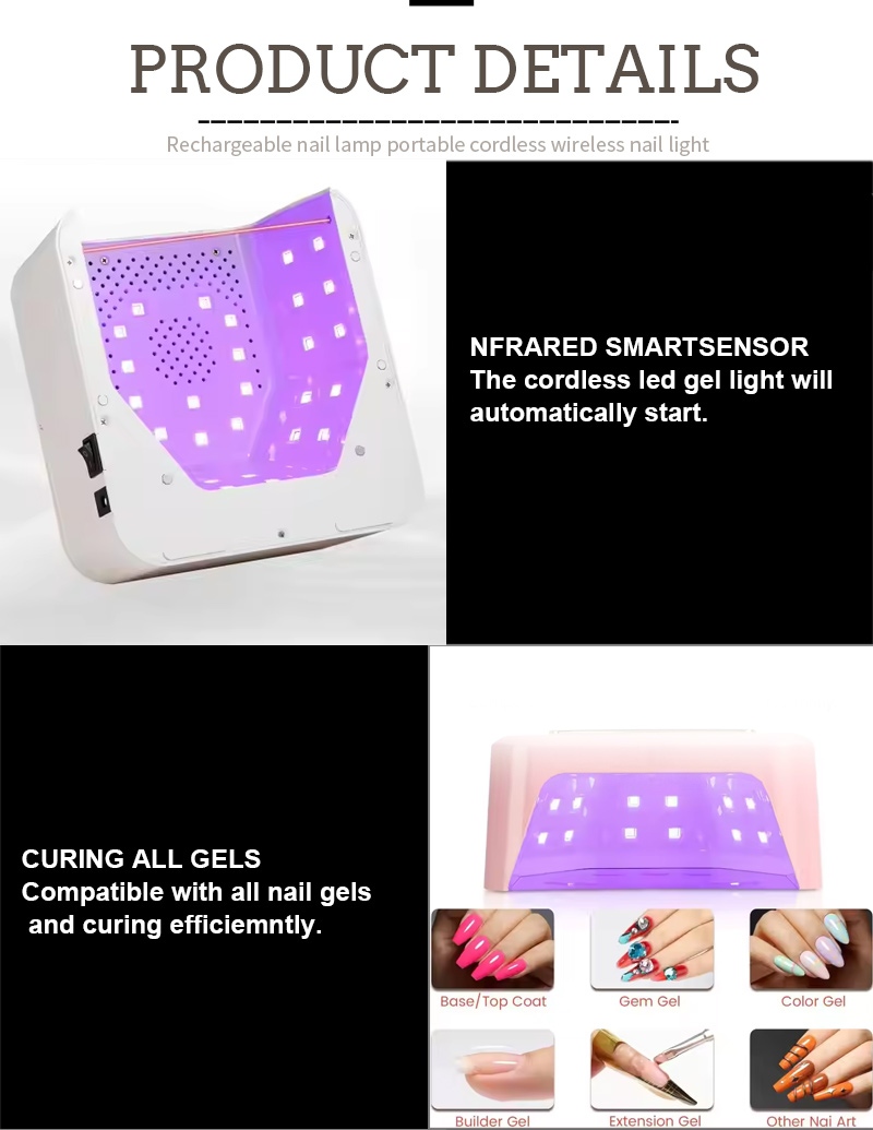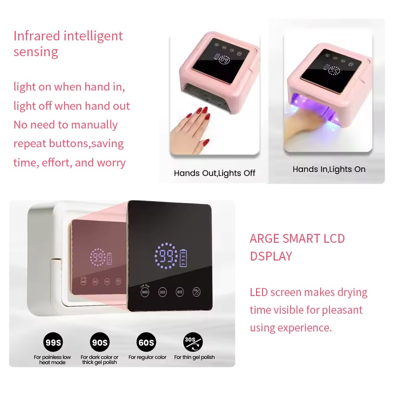 Đèn sấy móng vuông có công nghệ cảm biến thông minh hồng ngoại tự động chiếu sáng khi tay đến gần và tắt khi tay di chuyển ra xa—loại bỏ rắc rối khi phải nhấn nút nhiều lần và tiết kiệm thời gian, công sức. Keo nướng công suất cao không cần phải chờ đợi lâu, tiết kiệm cả thời gian và công sức.