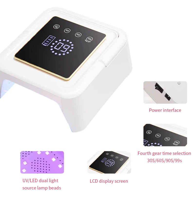 Đèn sấy móng vuông đảm bảo keo khô đều mà không bị co rút. Nguồn ánh sáng kép của nó cung cấp khả năng sưởi ấm nhẹ nhàng để tránh đổi màu tay và mỏi mắt, phù hợp cho cả tay và chân, mang lại kết quả làm khô nhanh đáng kể.
