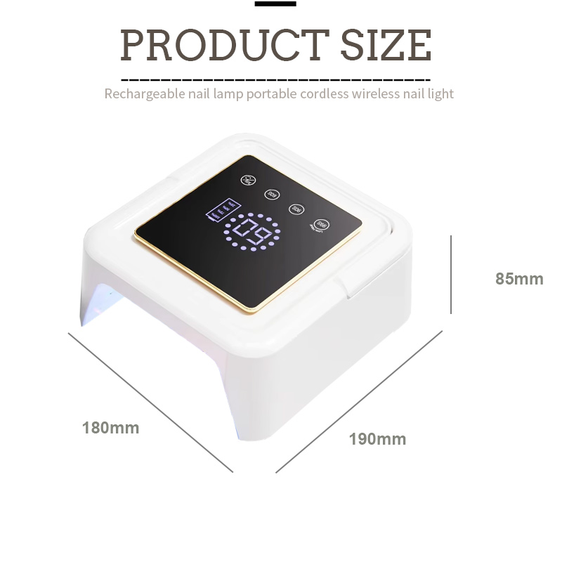 Kích thước của đèn sấy móng vuông là dài 180 mm, rộng 190 mm và cao 85 mm, công suất lớn và khả năng sử dụng cả tay và chân rất tiện lợi.