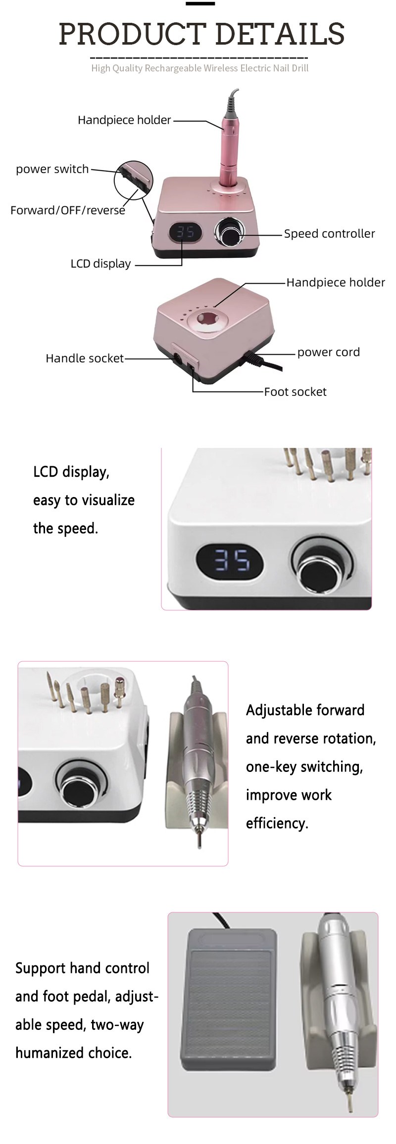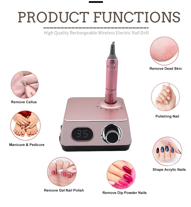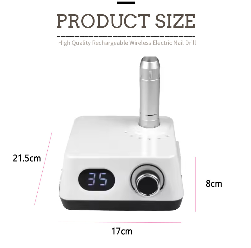 Thiết kế màn hình của máy khoan móng tay điện không dây tốc độ 35.000 vòng / phút này có công tắc bật/tắt và xoay tiến/lùi để kích hoạt tổng cộng bằng một nút bấm, ổ cắm sạc nhanh ở phía dưới, ổ cắm máy khoan có thể thay thế ở phía trên và tốc độ điều chỉnh ba vị trí để đáp ứng nhiều nhu cầu khác nhau.